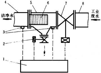 1、控制器2、排污電磁閥3、壓力傳感器4、出口管道5、過濾器殼體6、過濾介質7、管道電磁閥8、入口管道。